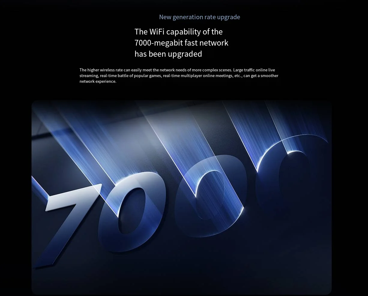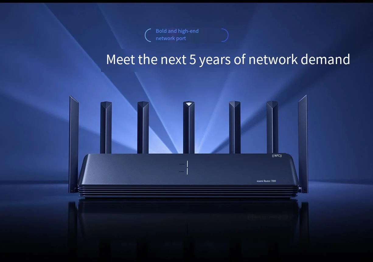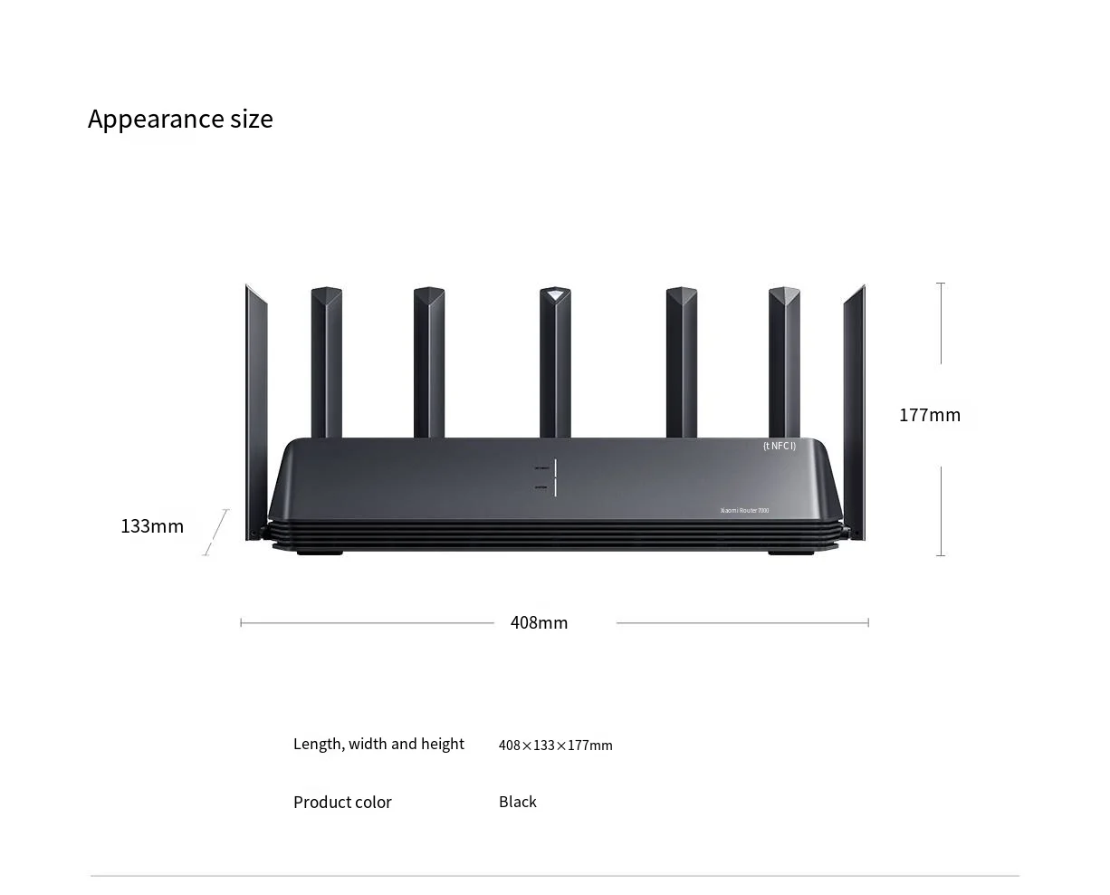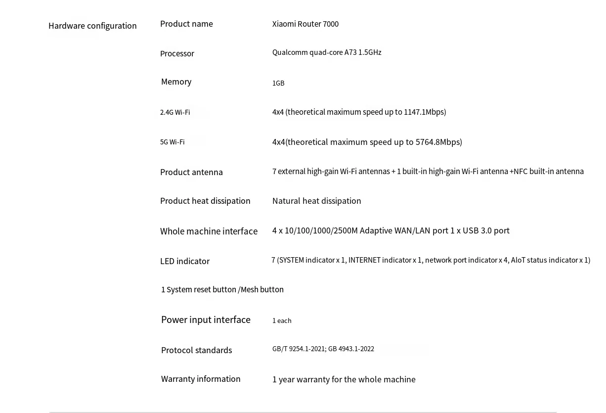Product parameters Product Name: Xiaomi Router 7000 Processor: Qualcomm Quad Core A73 1.5GHz Memory: 1GB 2.4G Wi-Fi:4 × 4 (Theoretical maximum speed can reach 1147.1 Mbps) 5G Wi-Fi:4 × 4 (Theoretical maximum speed can reach 5764.8 Mbps) Product antenna: 7 external high gain Wi Fi antennas+1 internal high gain Wi Fi antenna+NFC internal antenna Product heat dissipation: natural heat dissipation Machine interface: 4 × 10/100/1000/2500M adaptive WAN/LAN port 1 × USB 3.0 interface 7 LED indicator lights (SYSTEM indicator lights × 1. INTERNET indicator light × 1. Mesh port light × 4. AloT status light × 1) system reset button/Mesh button: 1 power input interface:1 Protocol standard GB/T 9254.1-2021GB 4943.1-2022 Wireless parameters Dual frequency mode (default) 2.4GHz and 5GHz Wireless channel 2.4GHz Channel:1,2,3,4,5,6,7,8,9,10,11,12,13 5GHzChannel:36,40,44,48,52,56,60,64,149,153,157,161,165 Triple frequency mode (requires manual switching) 2.4GHz, 5.2GHz, 5.8GHz Wireless channel 2.4GHzChannel:1,2,3,4,5,6,7,8,9,10,11,12,13 5.2GHzChannel:36,40,44,48,52,56,60,64 5.8GHz Channel:149,153,157,161,165 Software parameters Wireless security WPA PSK/WPA2 PSK/WPA3 SAE encryption, wireless access control (black and white list), SSID hiding, anti phishing network Management applications support web, Android, IOS Product accessories Instructions (including three pack card) 1 new network cable 1 product power supply (12V/3A) work environment Working environment temperature 0-40 ° C Working humidity 10%~90% RH (non condensing) Storage temperature -40~70 ° C Storage humidity 5%~90% RH (non condensing) |