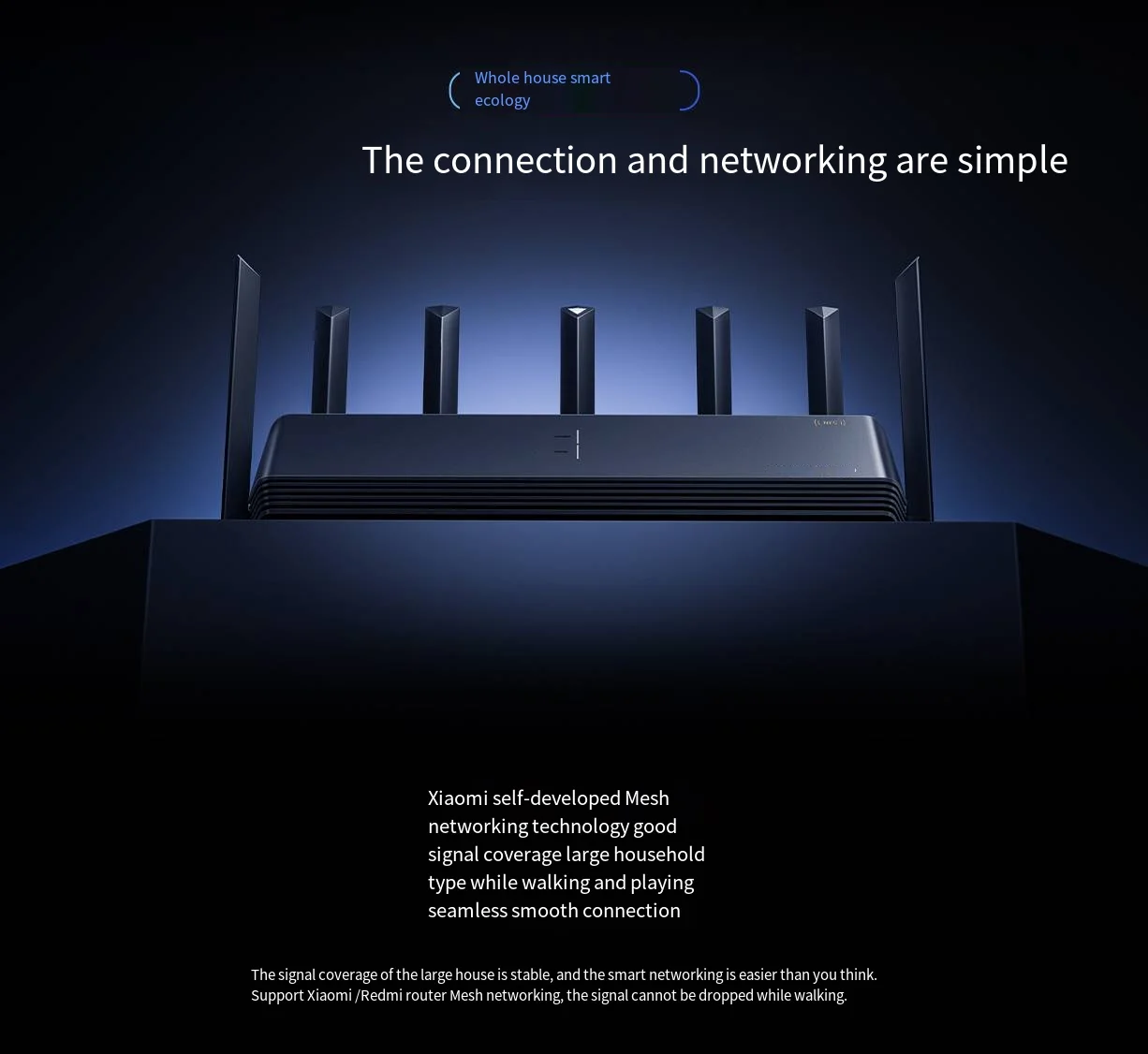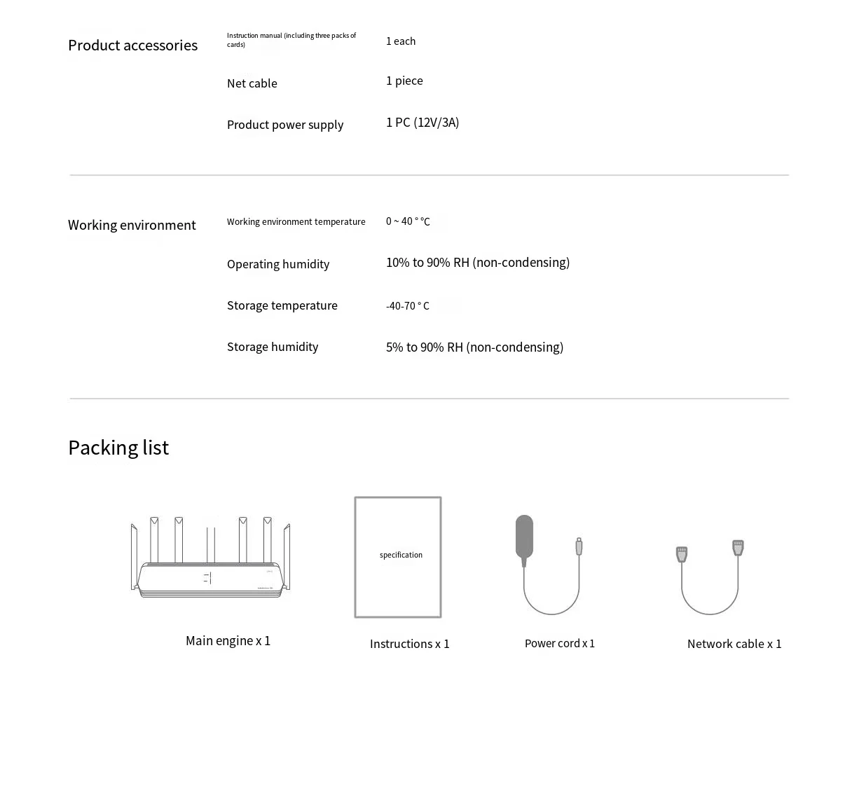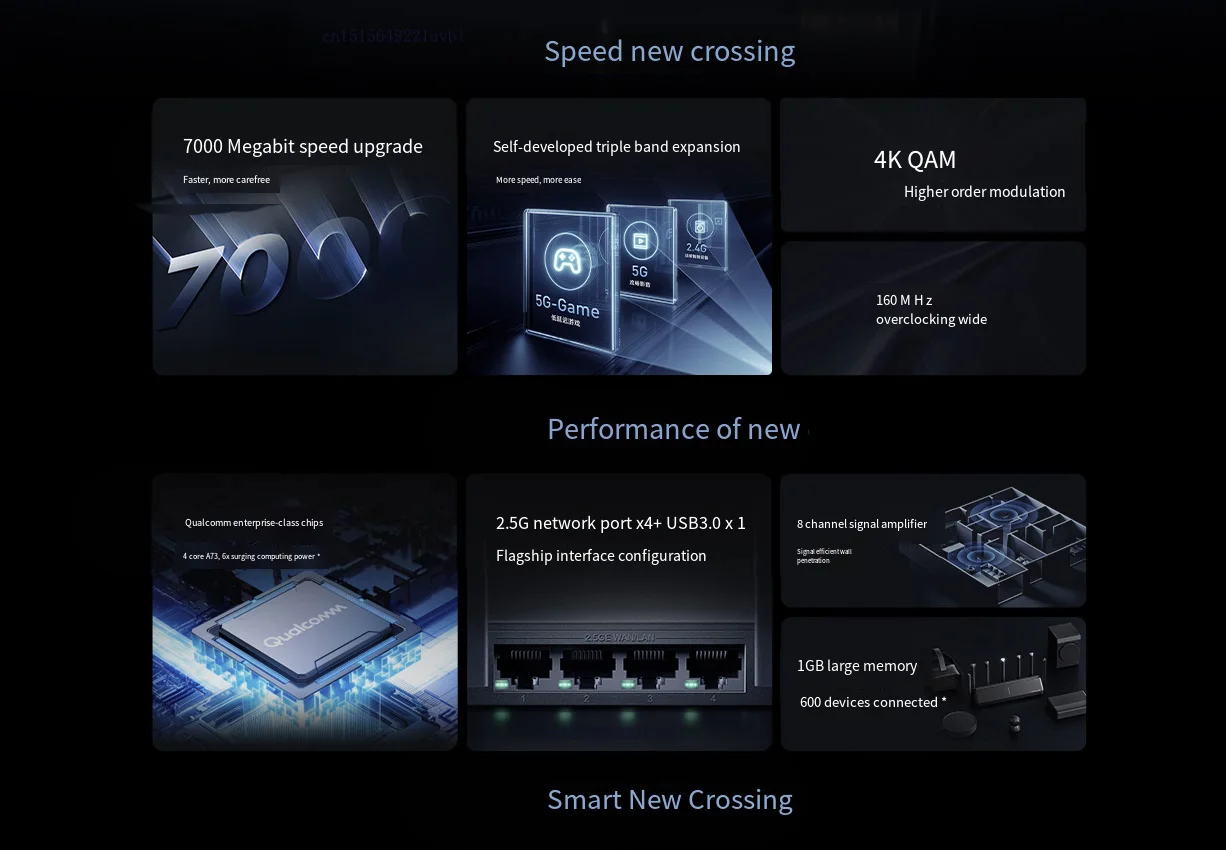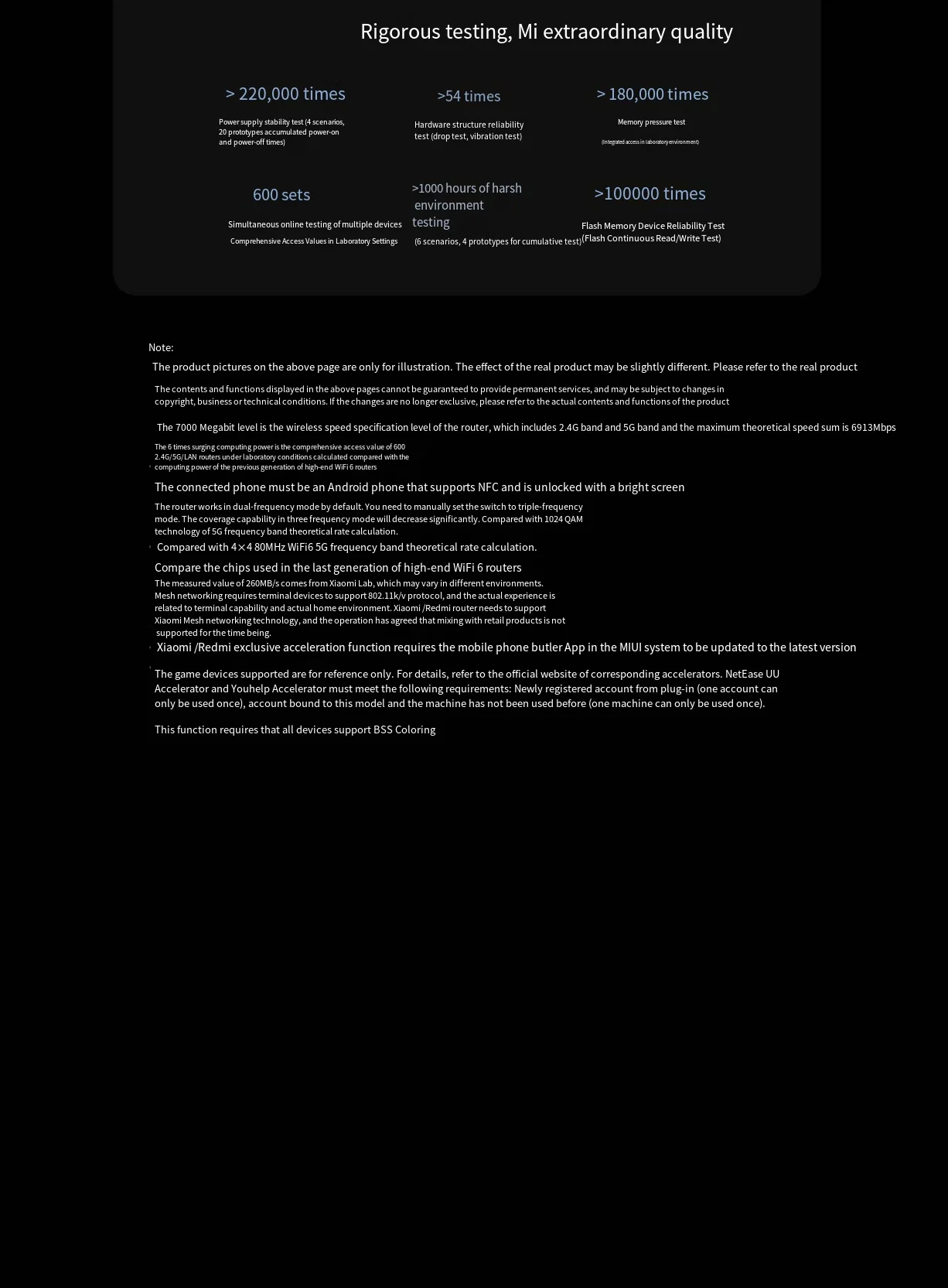 Product parameters Product Name: Xiaomi Router 7000 Processor: Qualcomm Quad Core A73 1.5GHz Memory: 1GB 2.4G Wi-Fi:4 × 4 (Theoretical maximum speed can reach 1147.1 Mbps) 5G Wi-Fi:4 × 4 (Theoretical maximum speed can reach 5764.8 Mbps) Product antenna: 7 external high gain Wi Fi antennas+1 internal high gain Wi Fi antenna+NFC internal antenna Product heat dissipation: natural heat dissipation Machine interface: 4 × 10/100/1000/2500M adaptive WAN/LAN port 1 × USB 3.0 interface 7 LED indicator lights (SYSTEM indicator lights × 1. INTERNET indicator light × 1. Mesh port light × 4. AloT status light × 1) system reset button/Mesh button: 1 power input interface:1 Protocol standard GB/T 9254.1-2021GB 4943.1-2022 Wireless parameters Dual frequency mode (default) 2.4GHz and 5GHz Wireless channel 2.4GHz Channel:1,2,3,4,5,6,7,8,9,10,11,12,13 5GHzChannel:36,40,44,48,52,56,60,64,149,153,157,161,165 Triple frequency mode (requires manual switching) 2.4GHz, 5.2GHz, 5.8GHz Wireless channel 2.4GHzChannel:1,2,3,4,5,6,7,8,9,10,11,12,13 5.2GHzChannel:36,40,44,48,52,56,60,64 5.8GHz Channel:149,153,157,161,165 Software parameters Wireless security WPA PSK/WPA2 PSK/WPA3 SAE encryption, wireless access control (black and white list), SSID hiding, anti phishing network Management applications support web, Android, IOS Product accessories Instructions (including three pack card) 1 new network cable 1 product power supply (12V/3A) work environment Working environment temperature 0-40 ° C Working humidity 10%~90% RH (non condensing) Storage temperature -40~70 ° C Storage humidity 5%~90% RH (non condensing) |
