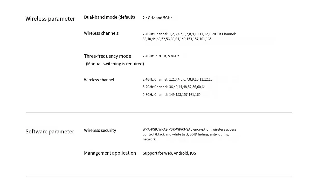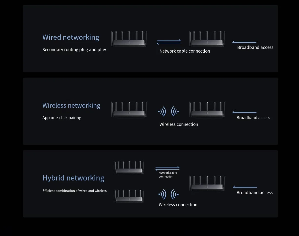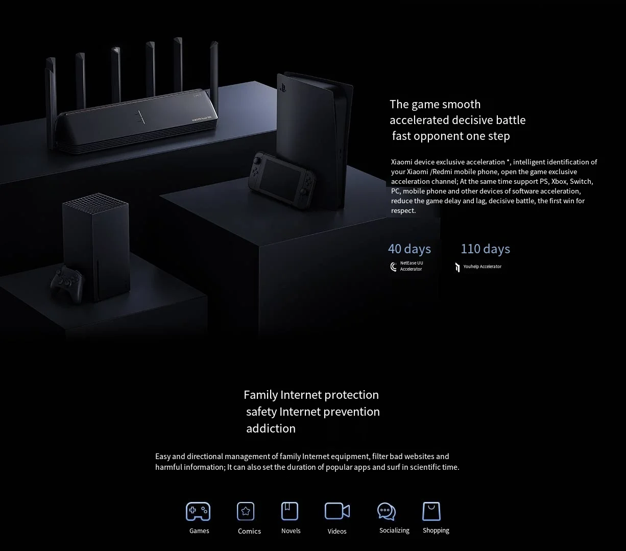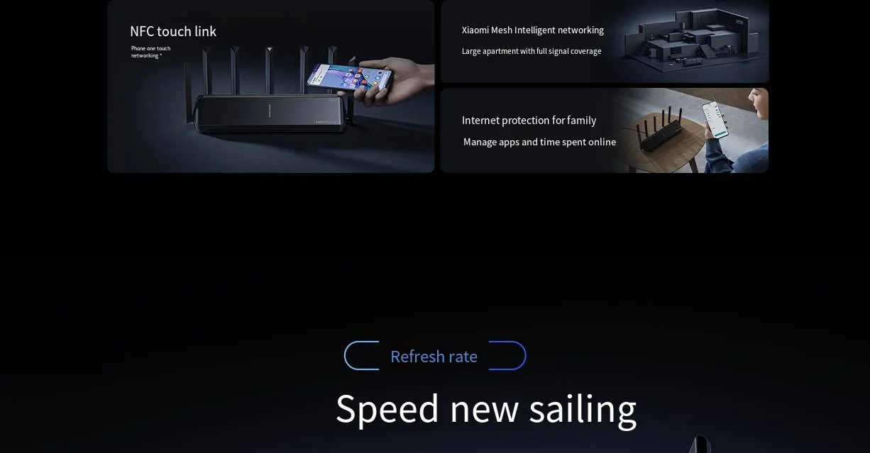 Product parameters Product Name: Xiaomi Router 7000 Processor: Qualcomm Quad Core A73 1.5GHz Memory: 1GB 2.4G Wi-Fi:4 × 4 (Theoretical maximum speed can reach 1147.1 Mbps) 5G Wi-Fi:4 × 4 (Theoretical maximum speed can reach 5764.8 Mbps) Product antenna: 7 external high gain Wi Fi antennas+1 internal high gain Wi Fi antenna+NFC internal antenna Product heat dissipation: natural heat dissipation Machine interface: 4 × 10/100/1000/2500M adaptive WAN/LAN port 1 × USB 3.0 interface 7 LED indicator lights (SYSTEM indicator lights × 1. INTERNET indicator light × 1. Mesh port light × 4. AloT status light × 1) system reset button/Mesh button: 1 power input interface:1 Protocol standard GB/T 9254.1-2021GB 4943.1-2022 Wireless parameters Dual frequency mode (default) 2.4GHz and 5GHz Wireless channel 2.4GHz Channel:1,2,3,4,5,6,7,8,9,10,11,12,13 5GHzChannel:36,40,44,48,52,56,60,64,149,153,157,161,165 Triple frequency mode (requires manual switching) 2.4GHz, 5.2GHz, 5.8GHz Wireless channel 2.4GHzChannel:1,2,3,4,5,6,7,8,9,10,11,12,13 5.2GHzChannel:36,40,44,48,52,56,60,64 5.8GHz Channel:149,153,157,161,165 Software parameters Wireless security WPA PSK/WPA2 PSK/WPA3 SAE encryption, wireless access control (black and white list), SSID hiding, anti phishing network Management applications support web, Android, IOS Product accessories Instructions (including three pack card) 1 new network cable 1 product power supply (12V/3A) work environment Working environment temperature 0-40 ° C Working humidity 10%~90% RH (non condensing) Storage temperature -40~70 ° C Storage humidity 5%~90% RH (non condensing) |